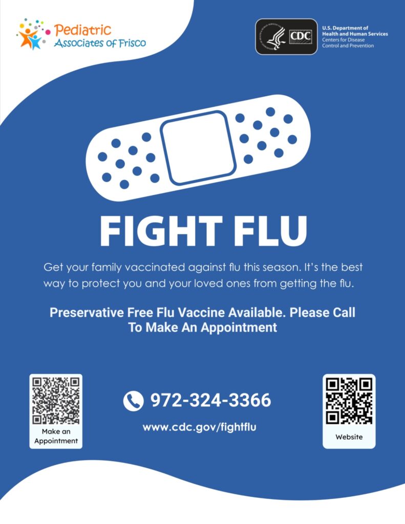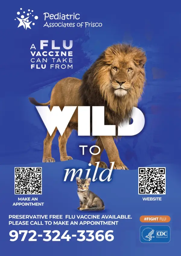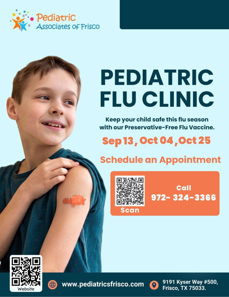 Pediatric Associates of Frisco is now offering preservative-free flu vaccines for all our patients. The flu vaccine is the best way to protect your child from the flu and its potential complications. The flu vaccine reduces the chances of getting the flu, but it can also make symptoms milder if you do catch it—turning what could be a wild illness into a mild one.