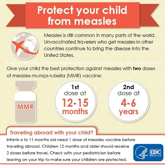 Be sure to talk to your pediatrician about a recommended vaccine schedule if your baby is under 12 months and will be traveling with you to an endemic area, a country with measles circulation or in case of a local outbreak of measles.